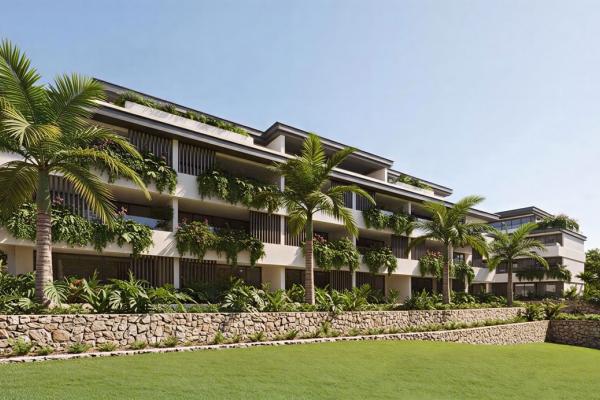 The development also offers a selection of amenities designed to enrich everyday life. Each block includes its own underground parking. Residents can enjoy a fully equipped gym, a dedicated spa area for quiet moments of relaxation, and a large central pool set within wide, open green spaces. Surrounded by the first line of golf, the entire community is wrapped in natural beauty, with trees, flowers, and landscaped gardens creating a calm, refreshing environment at every turn.