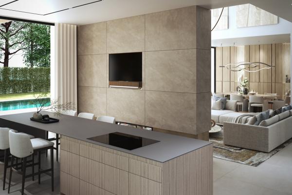The villas feature a special collaboration with BANG & OLUFSEN to provide a superior sensory experience in image and sound. The main entrance connects to a spacious living and dining room, separated by a double-sided fireplace. The kitchen, equipped with the prestigious BULTHAUP brand and Siemens appliances, is ideal for cooking enthusiasts.