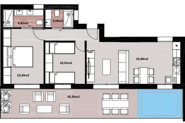 Entre los apartamentos destacan las plantas bajas con enormes terrazas y patios, con la opción de piscina privada, y los áticos con espectaculares soláriums con vistas al mar o a la montaña, piscina privada y bar.