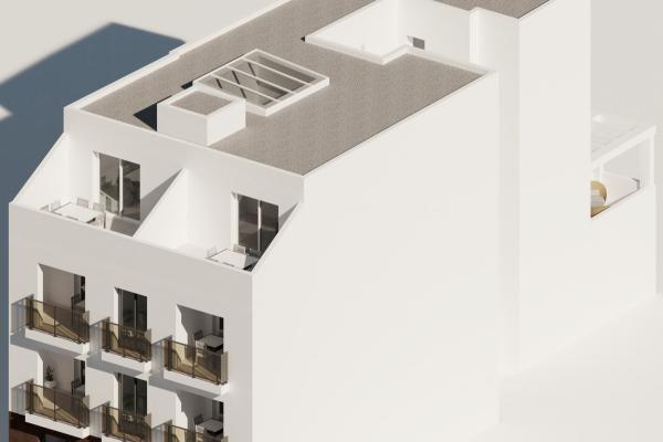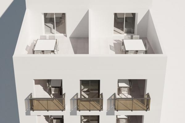 Son 6 apartamentos de 2 y 3 dormitorios, con 2 cuartos de baño, terraza y patio y 2 áticos con terrazas de 14 m 2. Edificio con ascensor, altas calidades, aire acondicionado calor/frío, cocina equipada.