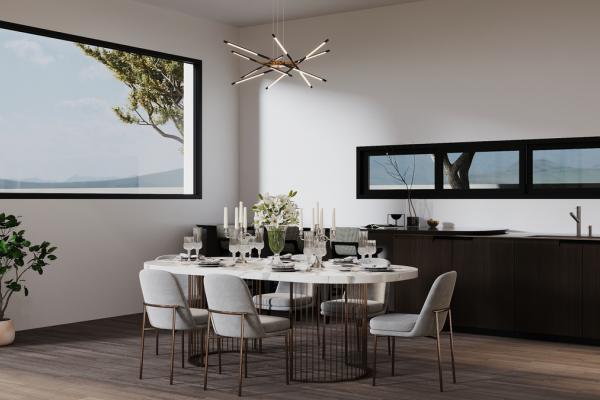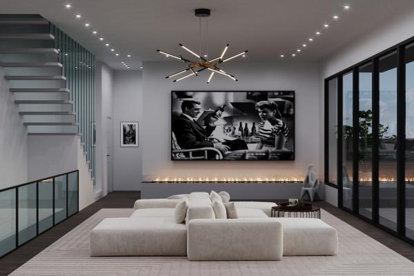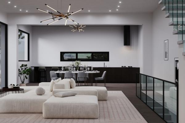 En la planta baja, se encuentra una impresionante y espaciosa sala de estar con grandes ventanales que inundan el interior de luz natural.
