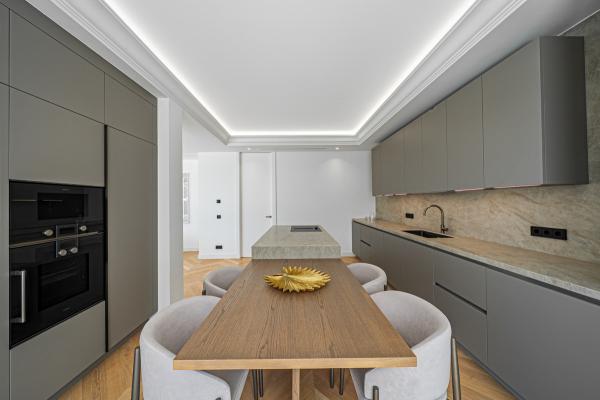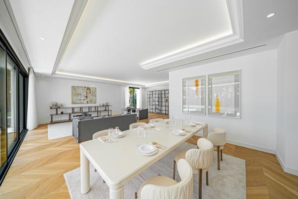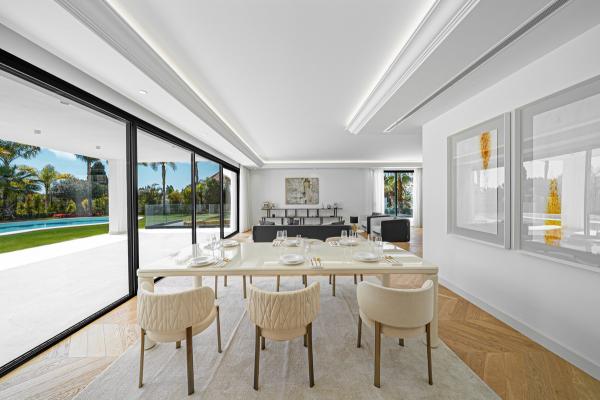 Al entrar a la villa, la planta principal ofrece un amplio espacio dividido en varias áreas. La cocina, totalmente equipada con electrodomésticos de última generación, cuenta con una isla hecha a medida.