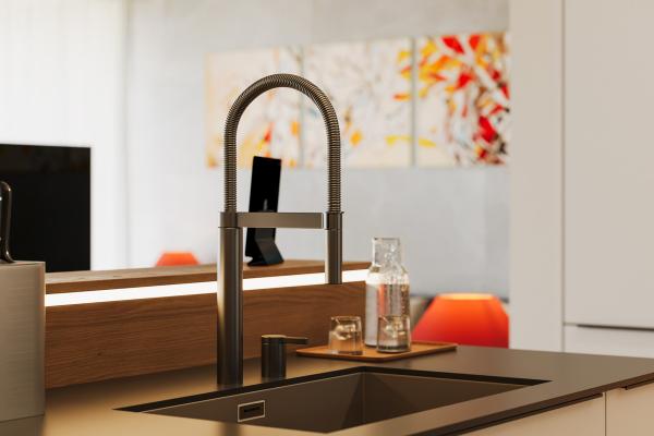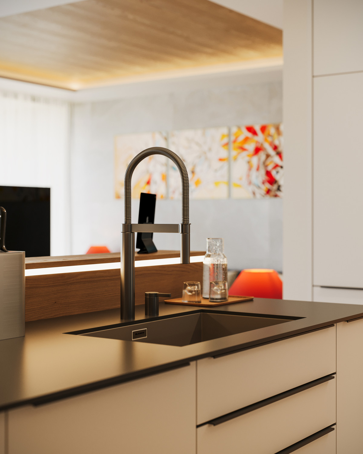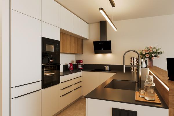 Al entrar en la planta baja, le da la bienvenida un hall de entrada que se abre a una amplia zona diáfana con una cocina elegante y funcional que cuenta con electrodomésticos Siemens de primera calidad, complementados con una nevera para vinos. Destaca por su funcionalidad la combinación empotrada de frigorífico y congelador de doble ala Haier. Desde el espacio central del comedor y el amplio salón se accede directamente a la terraza, que ofrece asientos al aire libre y una zona de barbacoa. Junto a ella hay un solárium equipado con tumbonas, que conduce a la piscina privada, todo ello rodeado de un hermoso jardín lleno de vegetación cuidadosamente seleccionada, incluidos árboles maduros.